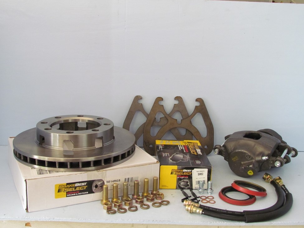 You get both brackets and six grade 8 bolts and zinc plated lock washers & nuts. We do supply the rotors, loaded calipers, (constitutes: calipers, pads and slide pins) the flex hoses (you must run flex hoses with this kit and adapt to your hard line). The calipers are the large single piston design.